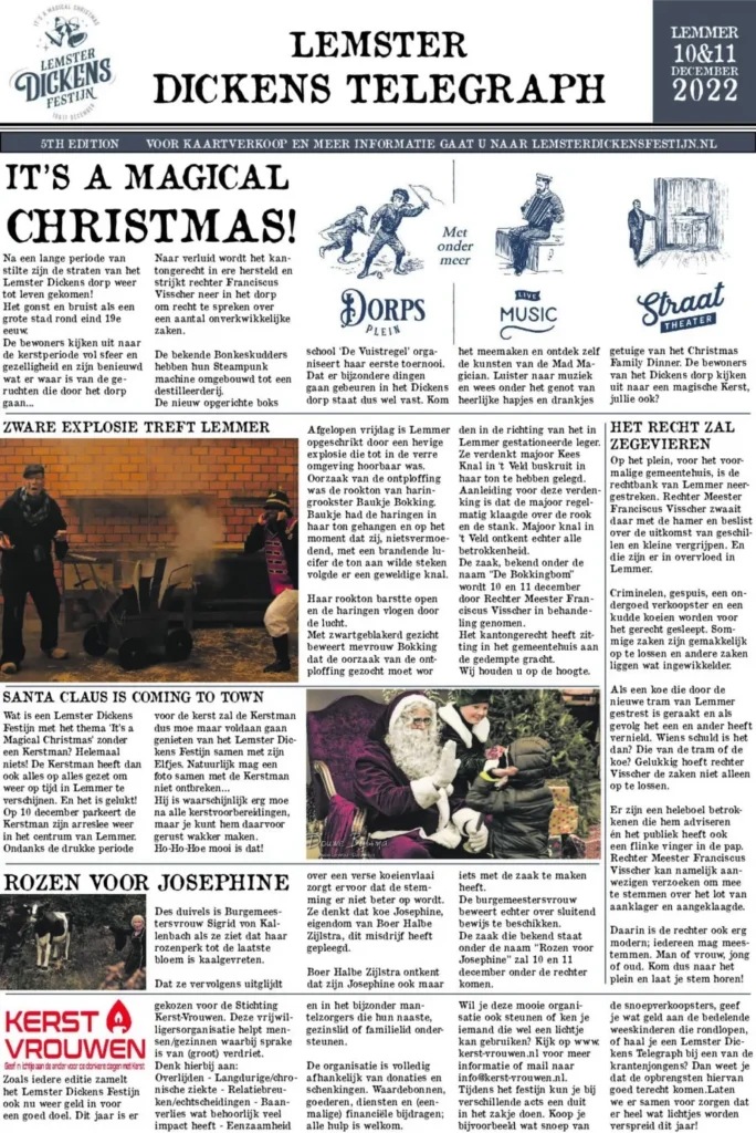 Ieder jaar maken we De Lemster Dickens Telegraph en verspreiden deze via de huis-aan-huis bladen in de Noordoostpolder en Zuid Friesland. Ook is deze krant te koop bij onze krantenjongens tijdens het festijn. De opbrengst gaat naar ons goede doel De kerst-vrouwen. In de krant lees je meer over de acts, achtergrondinterviews met vrijwilligers, de routekaart, de planning van de muziekacts en veel meer. Ga alvast terug in de tijd van Dickens en kom in de sfeer van a magical Christmas. Bekijk de krant online